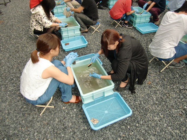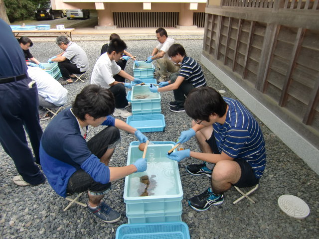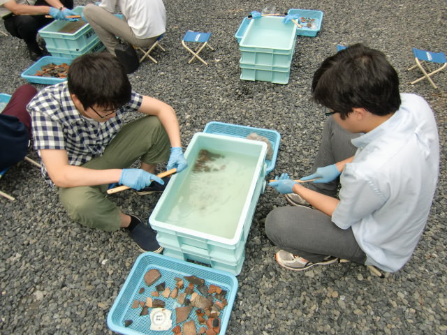 発掘された出土品を2人1組になってきれいに水で汚れをおとし、