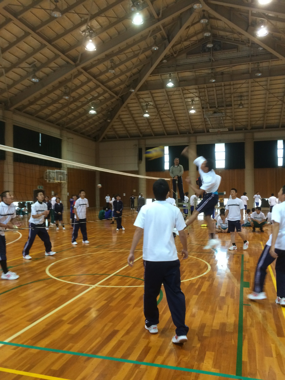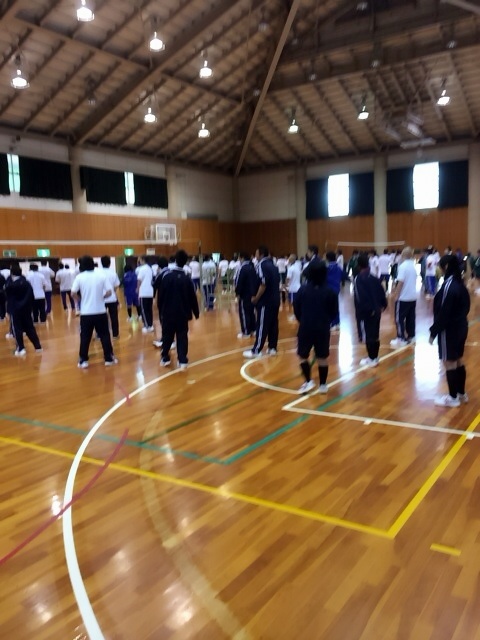 球技大会が開催されました。9月17日(木)球技大会が開催されました。 本来なら体育祭でしたが、あいにくの雨天のため体育館での球技大会に変更になりました。 各クラスとも急な予定変更の中チーム編成を考え、どのクラスもとても頑張りました。 教員チーム VS 3年生の試合も盛り上がりました。 優勝は3年B組第1チームです。おめでとうございます\(^0^)/